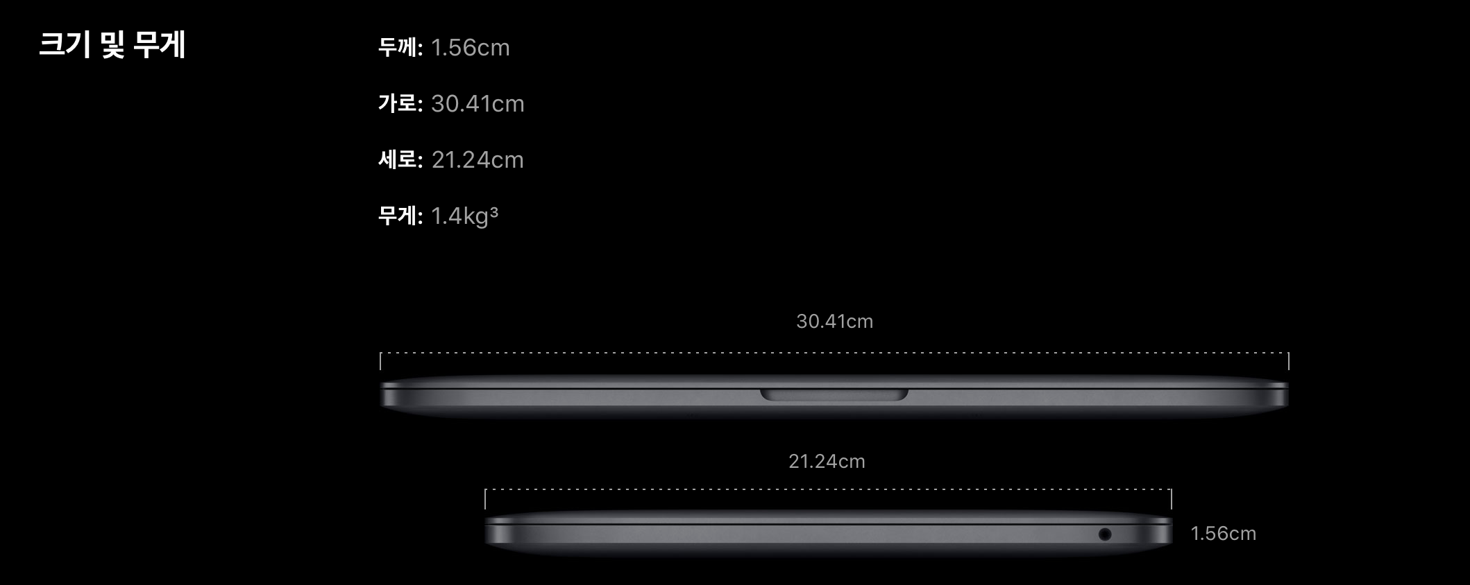 두 개 모델의 가로 세로 크기가 동일하고 두께는 맥북 에어가 평균적으로 얇지만 가장 두꺼운 부분은 맥북 프로보다 오히려 두껍습니다.