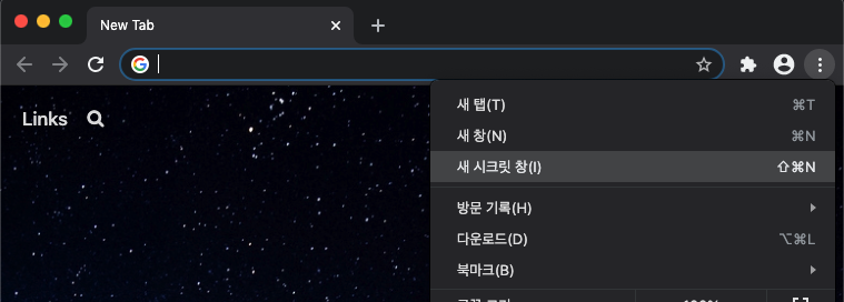 2. 브라우저 창이 열렸으면 오른쪽 상단의 점 세게 버튼을 클릭합니다. 그리고 새 시크릿 창이라는 메뉴를 선택합니다.