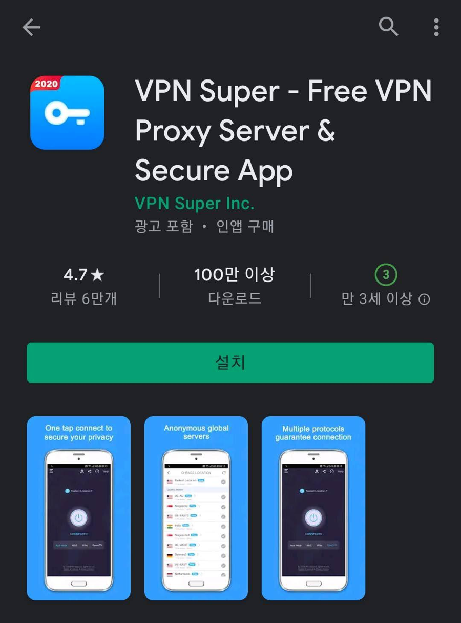 무료 VPN이 여러 개가 나와 있으니 본인이 편한 걸로 사용하시면 되고 저 같은 경우 무료이면서 본인이 원하는 해외 지역별의 서버 선택이 가능한 VPN을 설치해 사용했습니다. (구글 스토어 검색창에 vpn super unlimited proxy 입력)