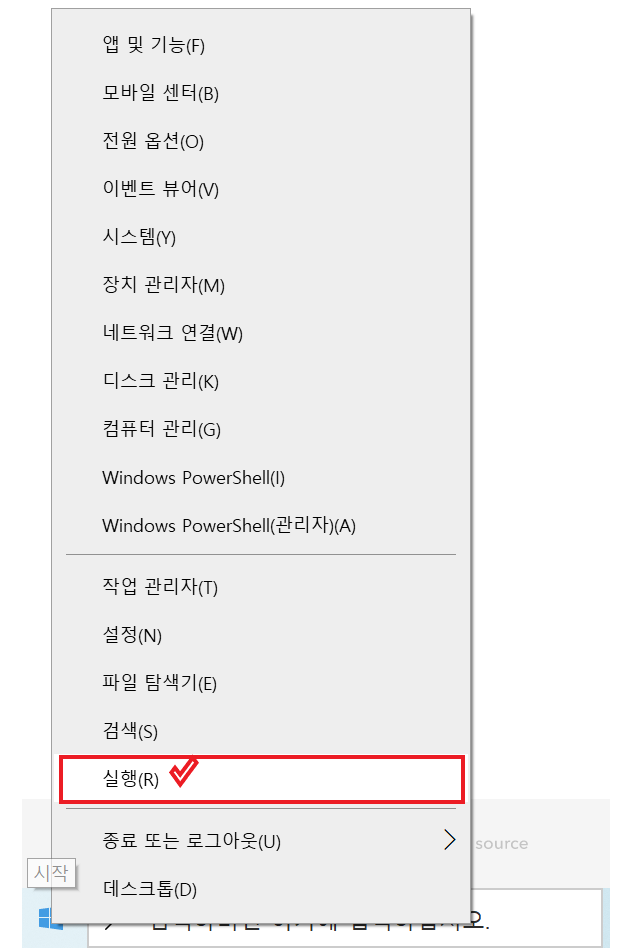 먼저 윈도우 10 로고가 있는 왼쪽 하단의 탭 위에 마우스 화살표를 갖다 댄 뒤 오른쪽 버튼을 클릭해 줍니다. 아래와 같이 메뉴바가 올라오면 실행(R)이라는 메뉴를 선택 클릭합니다.