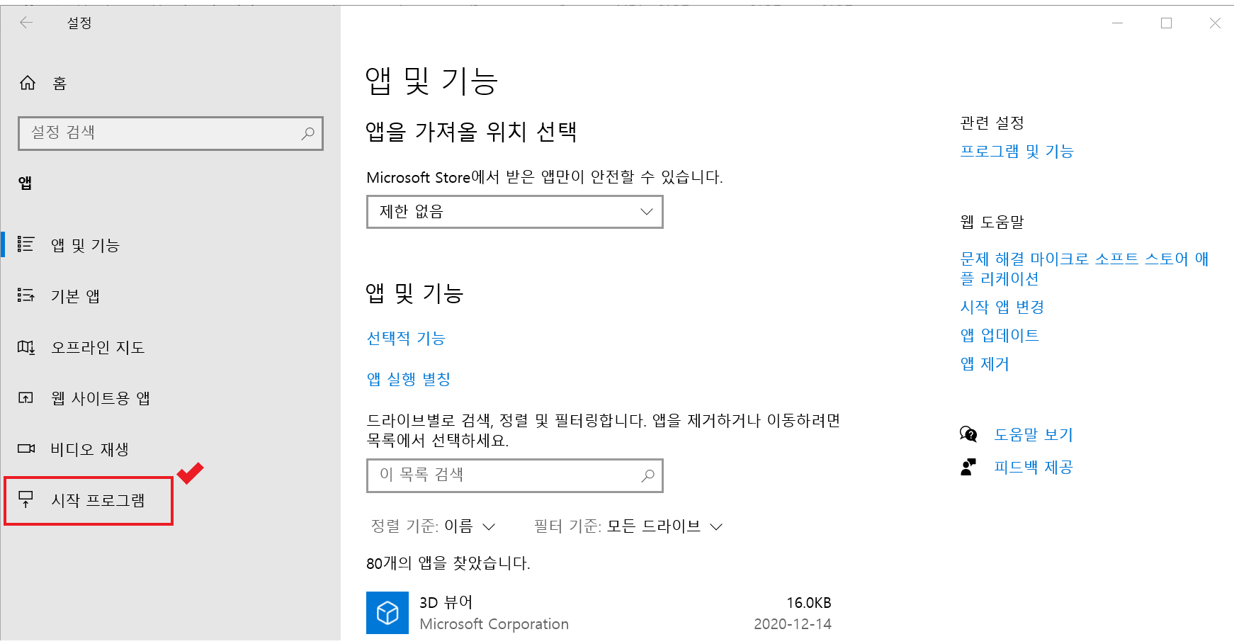 아래와 같이 앱 및 기능이라는 설정 화면이 나온는데 여기서 왼쪽 아래쪽의 시작 프로그램을 클릭합니다.