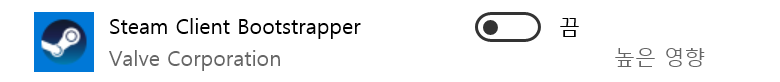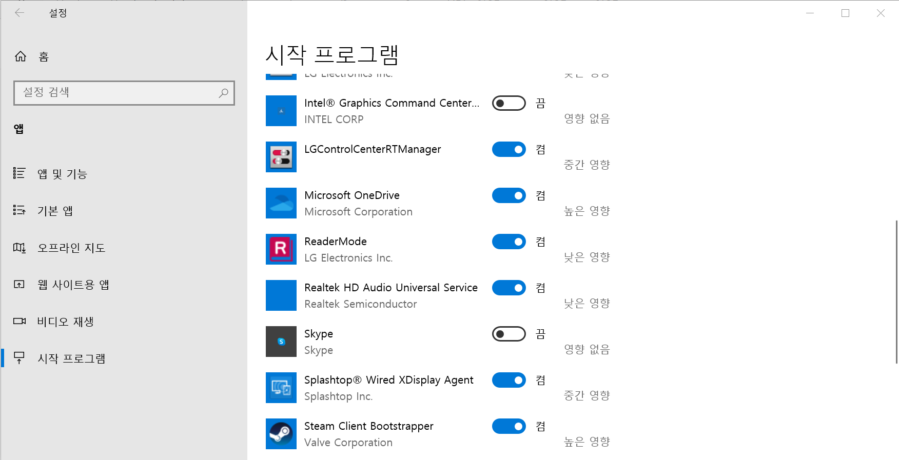 시작 프로그램으로 설정되어 있는 앱들이 목록으로 차례로 나오고 본인이 평소 잘 사용하지 않는 것들은 꺼두거나 반대로 자주 사용하는 것들은 켜 두면 됩니다.