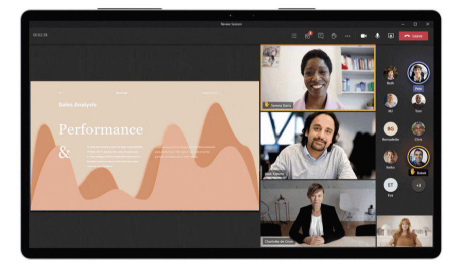 새롭게 구성된 화면에서 슬라이드를 발표와 동시에 나란히 주요 회의 참석자들의 모습을 가까이 볼 수 있기 때문에 라이브 이벤트가 필요한 회의에 이상적입니다.
