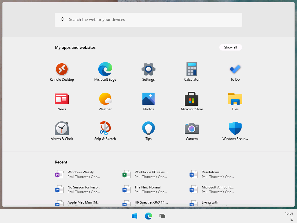 데스크톱 : 작업표시줄(Taskbar)은 화면 하단의 중앙에 배치. 기존 윈도우 10에서처럼 파일을 저장하는데 바탕화면을 사용할 수 없는 구조로 되어 있음