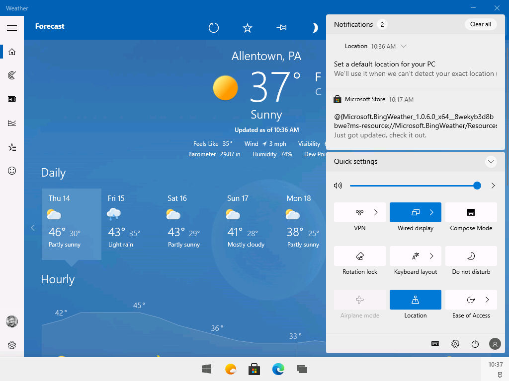 액션 센터(Action Center) : 크롬 OS와 매우 유사한 형태의 유저 인터페이스로 날씨, 공지사항, 기기 간편 설정 등의 메뉴가 보임