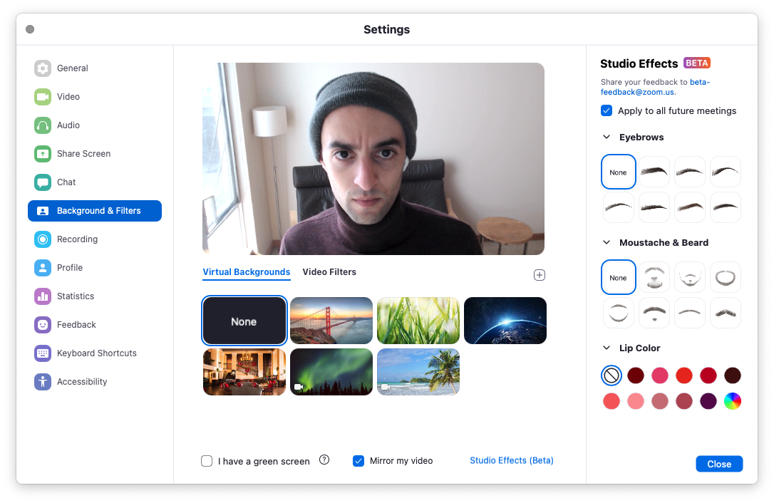 화상회의 플랫폼 줌(Zoom)의 스튜디오 이펙트 베타(Studio Effects beta) 서비스를 통해 얼굴에 눈썹, 수염 및 입술에 컬러 필터를 그리는 방법을 IT 매체인 더버지(The Verge)가 전했습니다.
