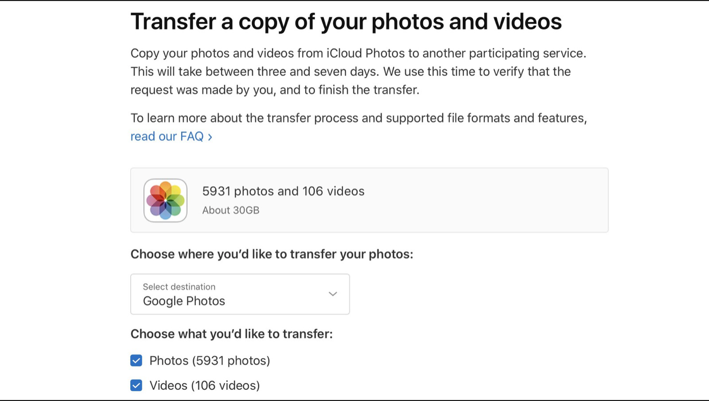아래는 IT 매체인 맥루머스(MacRumors)를 통해 올라온 아이클라우드 사진 구글 포토 전송 화면 이미지입니다.