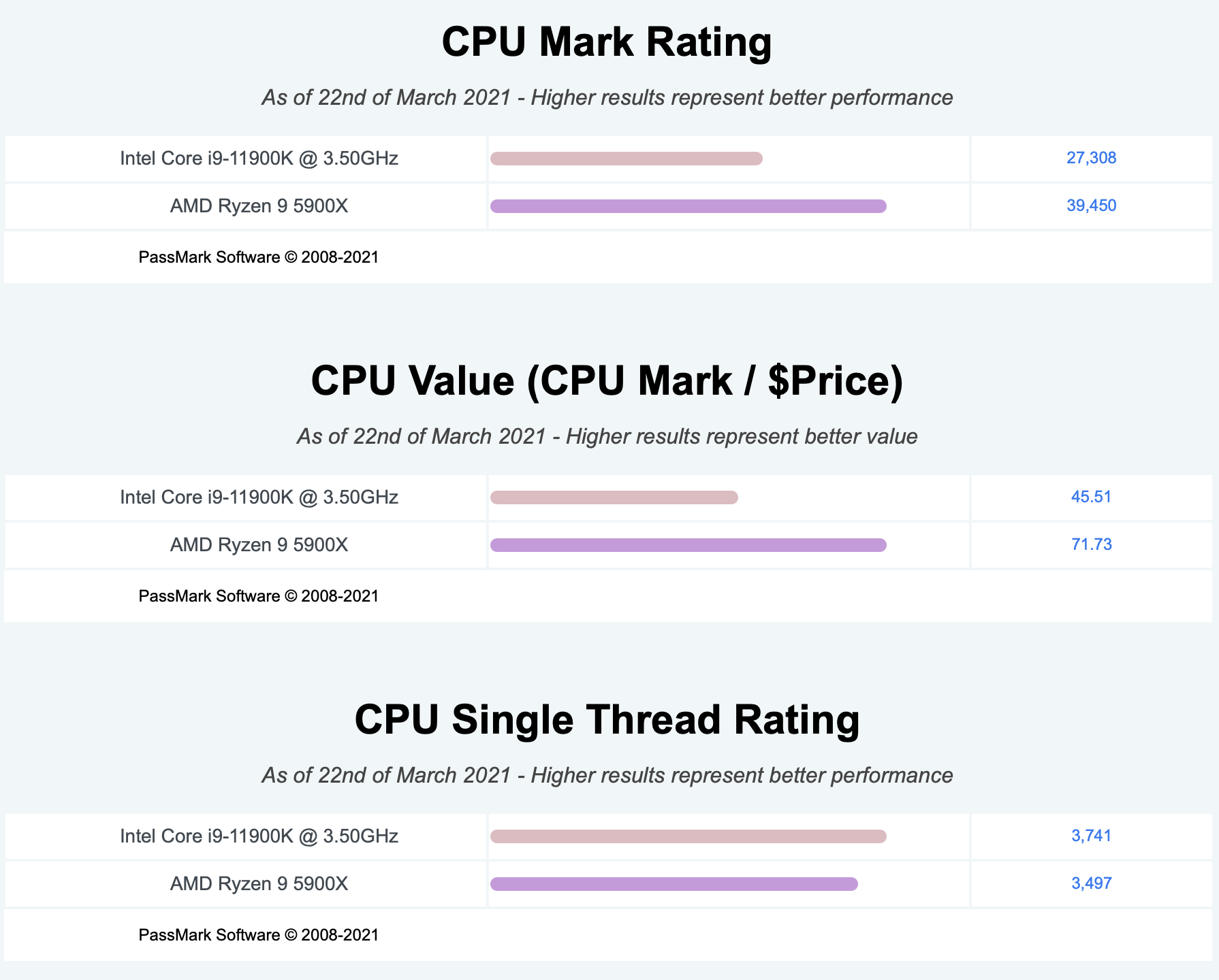 CPU Benchmarks라는 사이트에서 인텔 i9-11900K와 AMD Ryzen 9 5900X를 비교한 정보를 살펴보겠습니다.