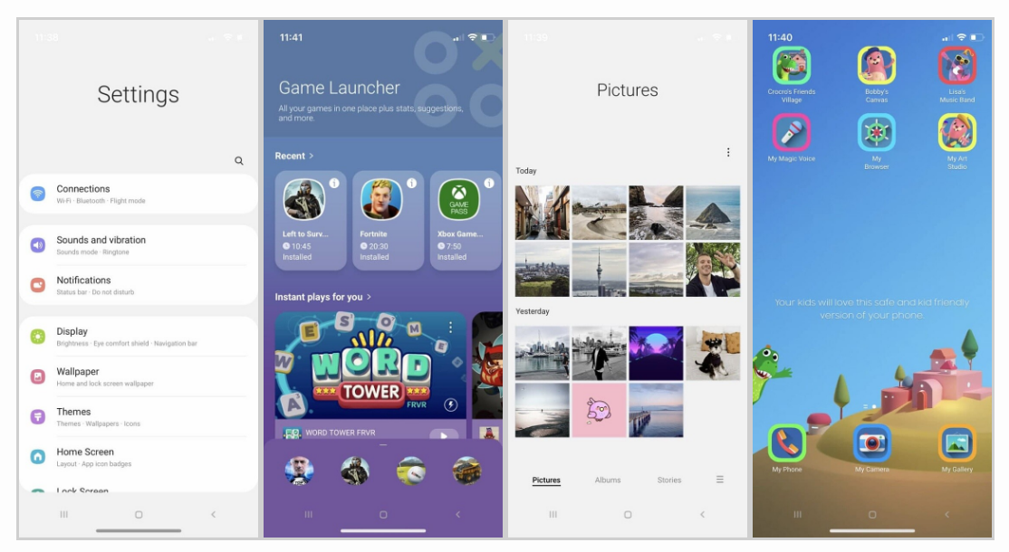 삼성 테마 앱을 열어보면 시스템 인터페이스 전반의 디자인을 바꿀 수 있고, 삼성 키즈 앱을 실행하면 아이들로부터 스마트폰을 보호할 수 있는 암호 화면도 나타납니다.
