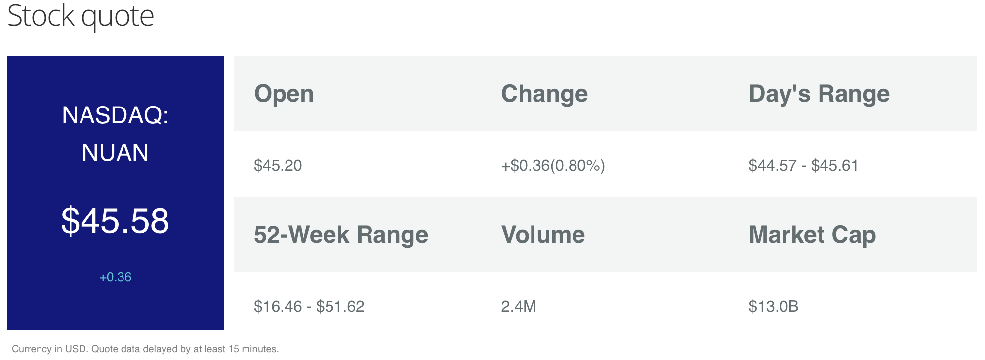 블룸버그에 따르면 마이크로소프트는 음성인식 인공지능 개발을 전문으로하는 뉘앙스를 160억 달러를 주고 회사를 인수하려고 하며 이를 주식 1주당 가격으로 환산하면 56달러가 됩니다. 뉘앙스(Nuance)는 나스닥(Nasdaq)에 상장되어 있는 기업인데 4월 12일 자 기준 거래 시세인 45달러 대비 20% 정도 높은 가격으로 마이크로소프트가 인수를 하겠다는 것입니다.