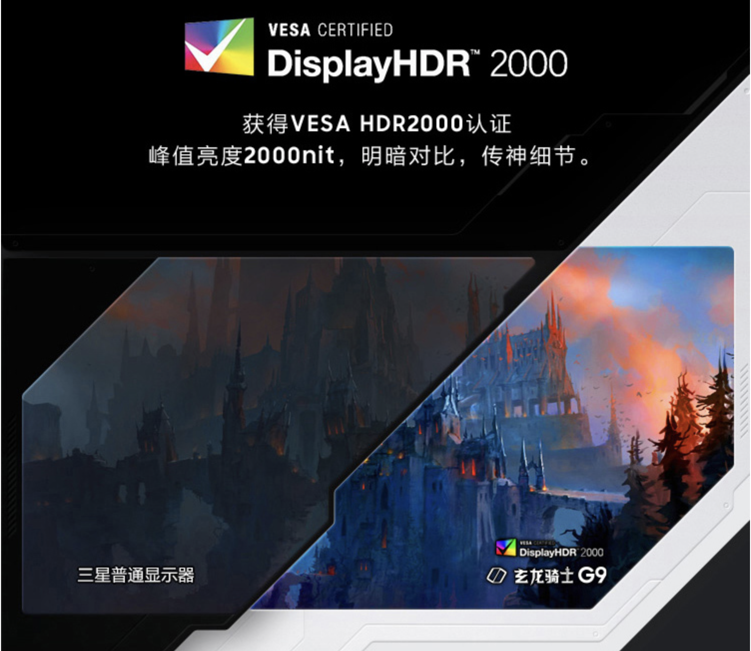 타오바오 사이트에는 2021년형 오디세이 G9이 VESA가 인증하는 DisplayHDR2000을 지원한다고 설명하고 있습니다. 작년에 출시된 오디세이 G9에는 1,000 니트(nits) 밝기의 DisplayHDR1000을 지원하는 QLED를 탑재했는데, 올해 신모델에는 미니 LED의 탑재로 작년보다 두배 높아진 2,000 니트 밝기를 지원할 것으로 보입니다.