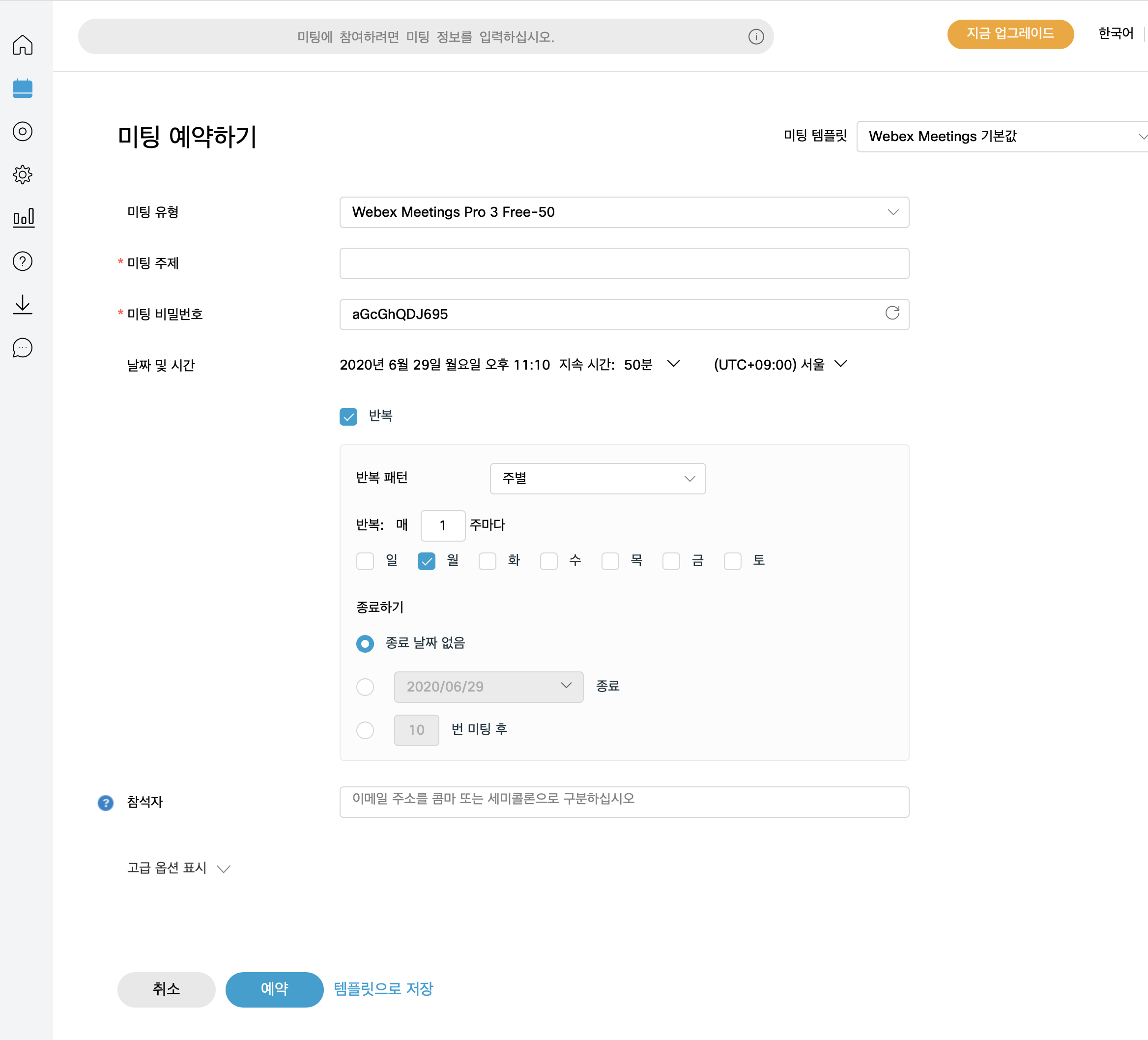 회의 시간을 입력하고 초대하고자 하는 사람들의 메일 주소를 입력 합니다. 만약 동일한 형태의 회의가 반복된다면 현재 입력한 예약 정보를 템플릿으로 저장하거나 화면 상의 반복을 클릭해서 건건히 입력해야하는 수고를 줄일 수도 있습니다.