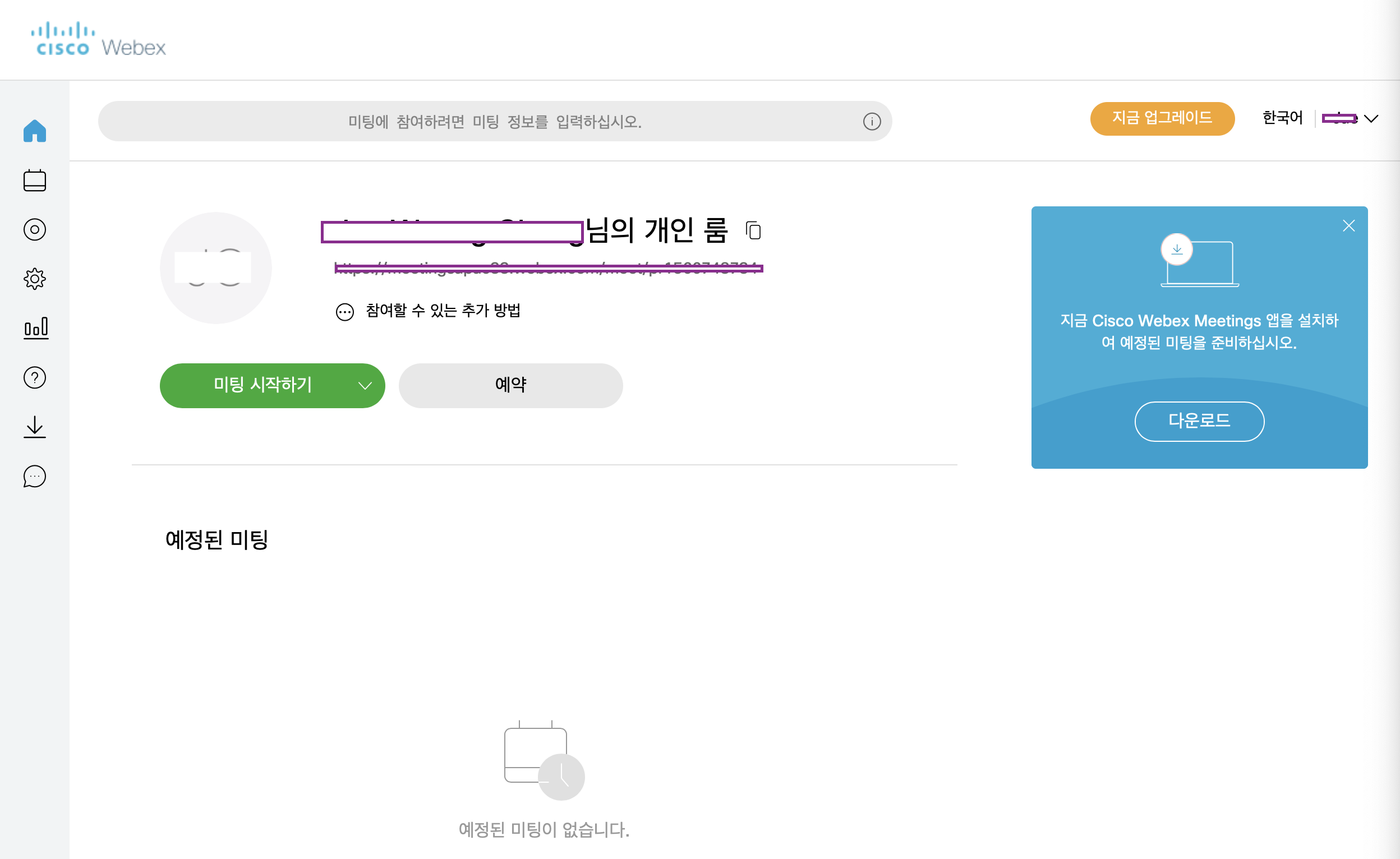 개인 룸은 화상 회의를 시작하거나 예약하는 장소 입니다. 또한 다른 사람들에게 화상 회의를 초대하기 위한 주소값을 표시해 줍니다.
