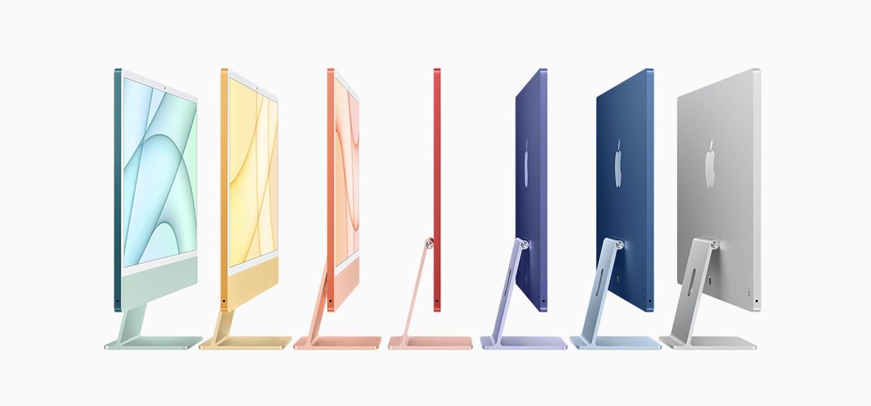 그리고 무엇 보다 인텔 아이맥에는 색상이 한 가지로만 나오는데 24인치 신형 아이맥에는 블루, 그린, 핑크, 실버와 8코어 GPU 모델에는 옐로우, 오렌지, 퍼플까지 최대 7가지 색상을 고를 수 있습니다. 아이폰처럼 아이맥도 본인의 취향에 따라 색상을 선택할 수 있다는 게 매력 포인트입니다.