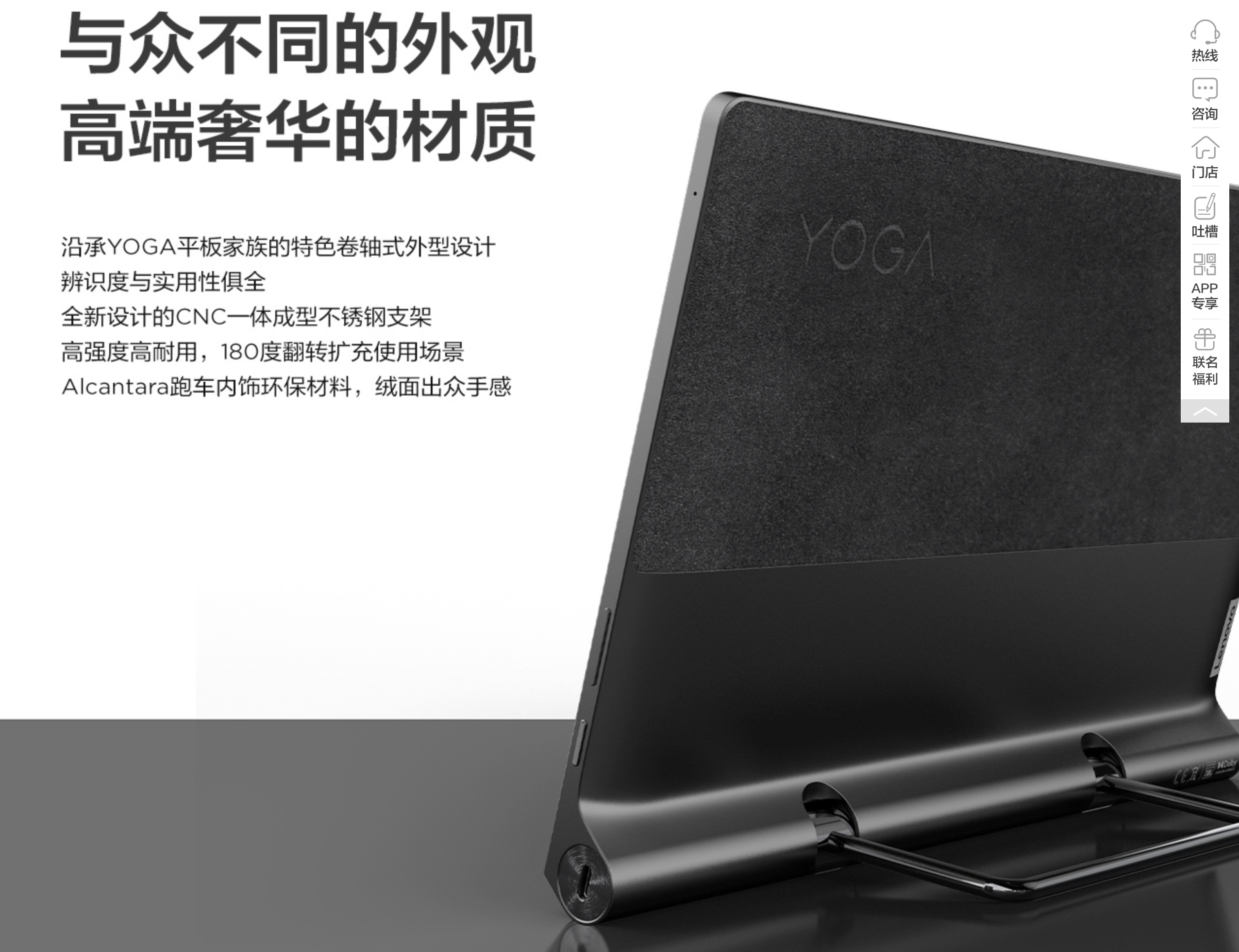 요가 패드 프로 뒷면에는 고급 자동차 인테리어 마감재로도 사용되는 알칸타라가 사용되었으며 태블릿을 세우거나 벽에 걸 수 있도록 고리 모양의 거치대 장치도 부착되어 있습니다.