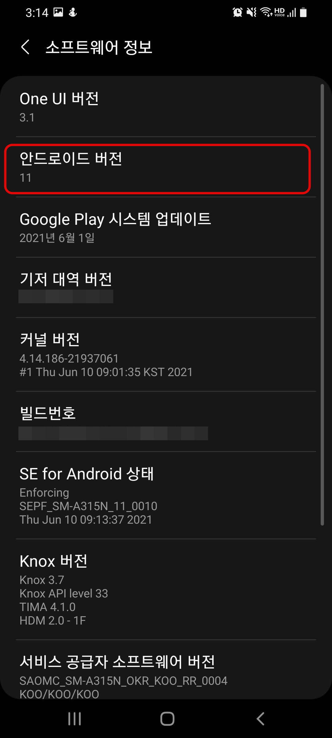 4. '소프트웨어 정보'에서 안드로이드 버전 조회 가능. 아래는 11 버전의 안드로이드 OS가 설치되어 있는 것을 확인