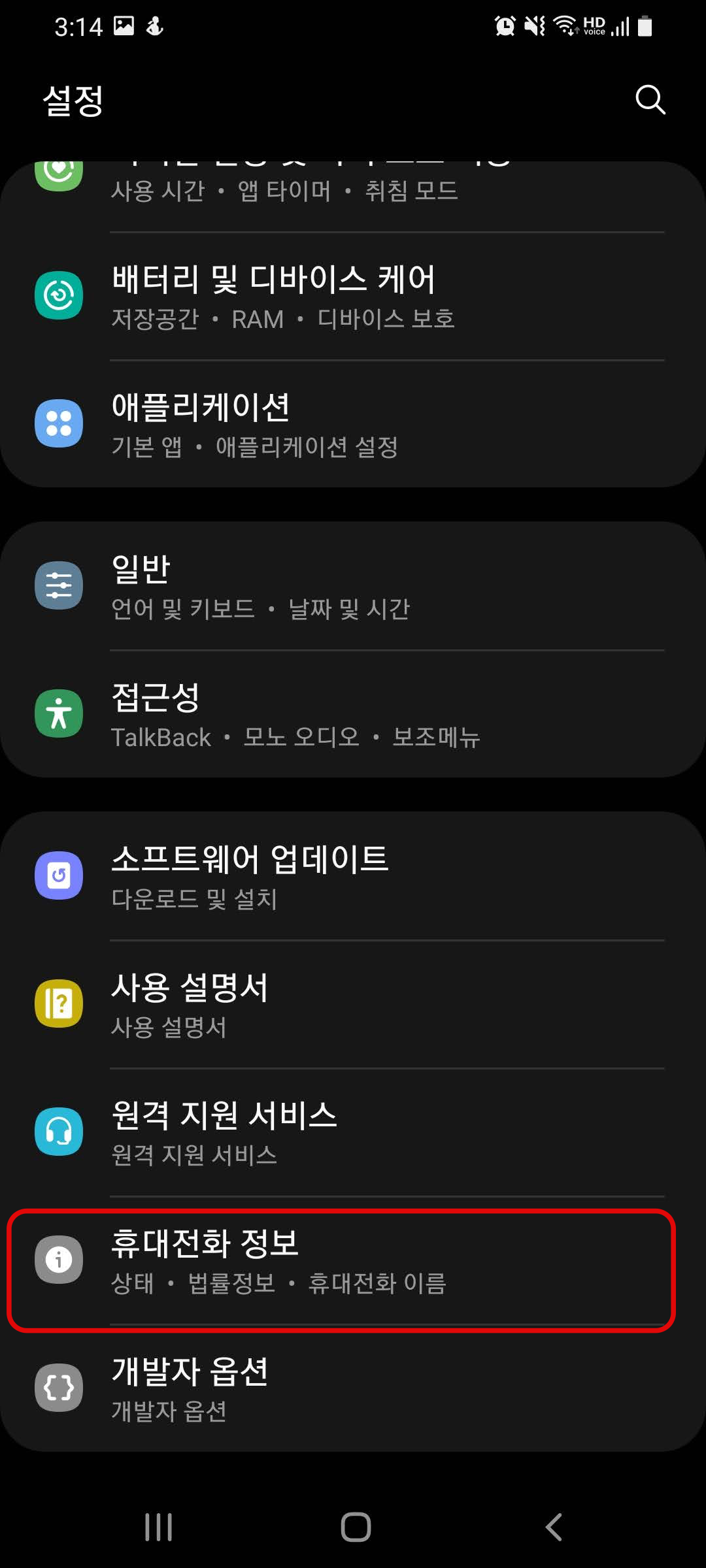 2. '설정' 앱에서 '휴대전화 정보' 메뉴 선택해서 들어감