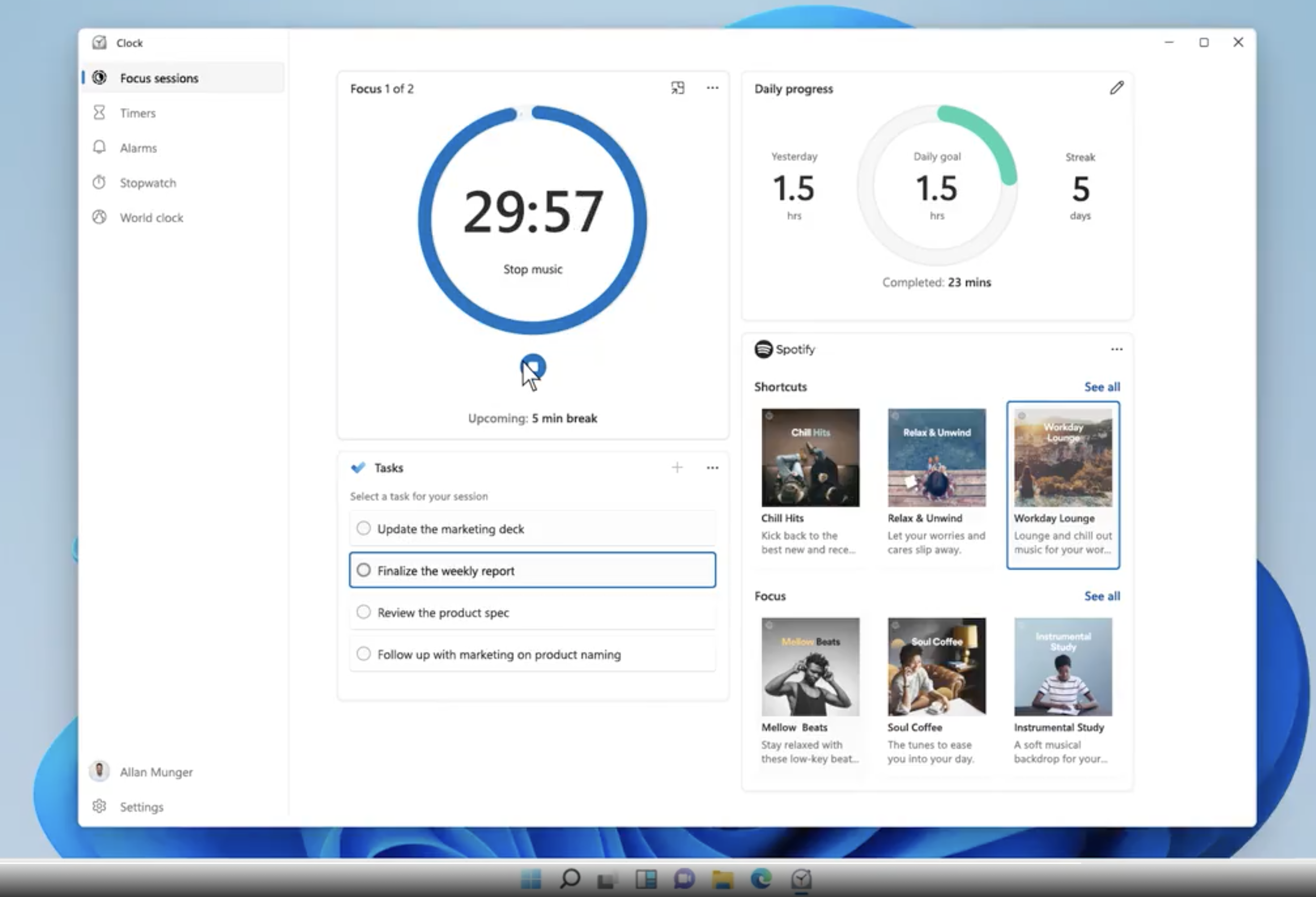 Another first look from the team...#FocusSessions on #Windows11 coming soon. This has been a game-changer for me, especially with @Spotify integration #Productivity #Creativity #WindowsInsiders pic.twitter.com/HfJh4niDiS
