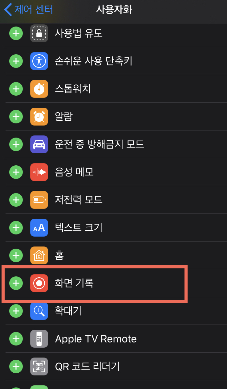 이후 설정 > 제어센터> 제어 항목 사용자화로 이동한 다음에 화면 기록 옆에 있는