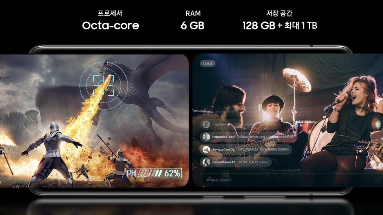 디스플레이는 6.4인치의 풀 HD+ 급 super AMOLED가 들어갑니다. 애플 등 해외 브랜드의 엔트리 모델에는 보통 LCD가 들어가는데 디스플레이만큼은 보급기에서 경쟁 모델보다 확실히 우위에 있습니다. 또한 평면 디스플레이로 삼성의 곡면 디스플레이보다 가장자리 부분의 파손 우려가 덜하다는 점도 어찌보면 장점입니다. 향후 삼성에서 고급 기종에도 평면 디스플레이를 사용할 것이라고 하는데, 곡면 디스플레이가 외관상 물론 좋아는 보이지만 장기간 이용에는 선호도가 그다지 높지 않은 부분으로 보여 집니다. 전면부 카메라의 인피니티 U로 처리된 부분도 특징인데 인피니티 O랑 비주얼 측면에서 약간 다르지만 화면을 감상하는 데는 이 부분도 큰 차이점은 아닌 것 같습니다. 보급기에서 디스플레이 품질은 이만하면 나무랄 데가 없다고 봅니다.