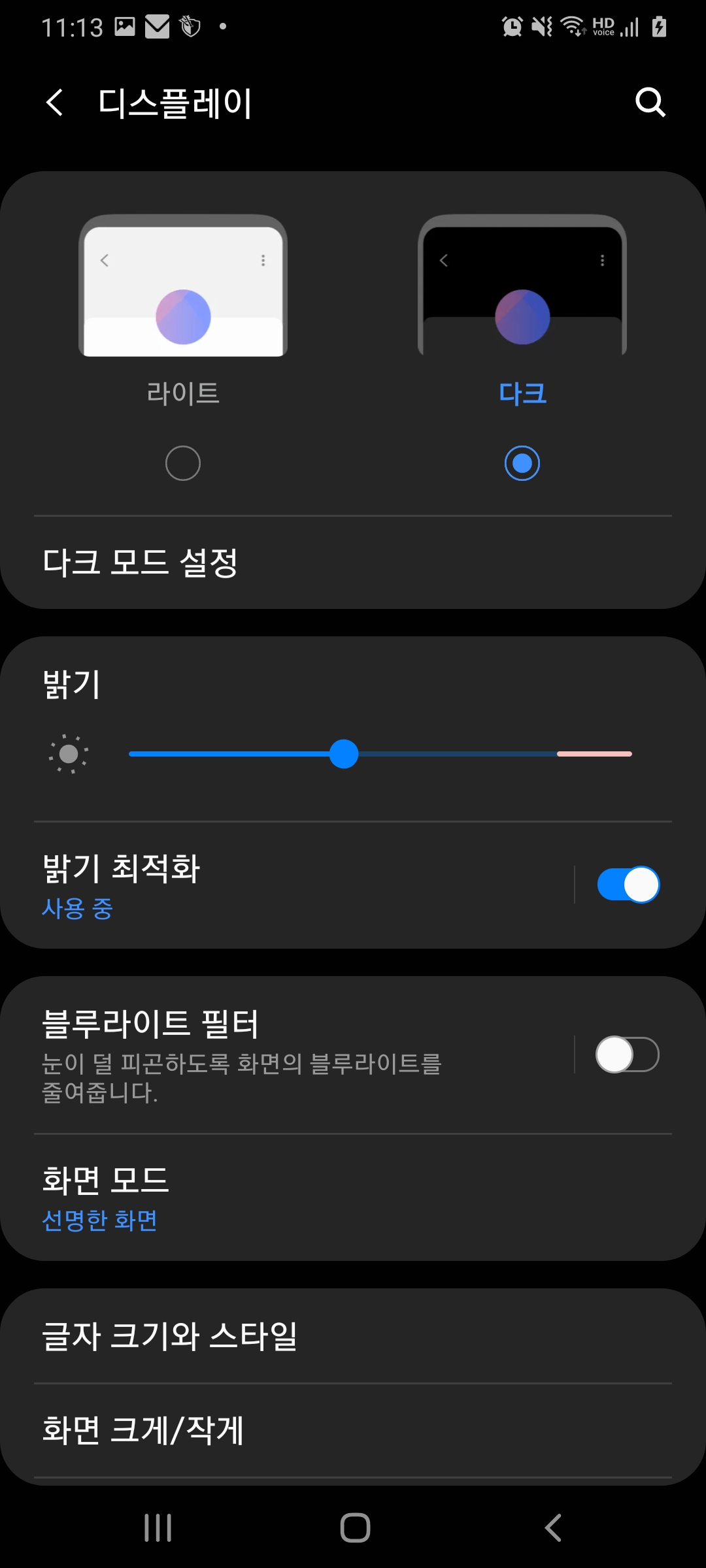 이런 다크모드를 활용하기 위해서는 안드로이드에서 설정 앱(App)을 실행한 뒤에 디스플레이 메뉴를 선택 후 상단의 다크를 모드를 선택하면 됩니다.