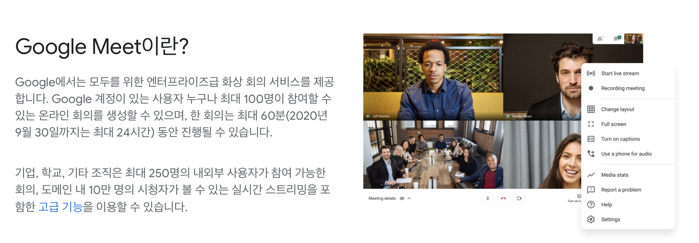 이미 구글의 화상 회의를 사용해보신 분들은 행아웃 미팅에 대해 아실 텐데 올해 4월부터 Google Meet로 리브랜딩 되었다고 하니 참조하시길 바랍니다.