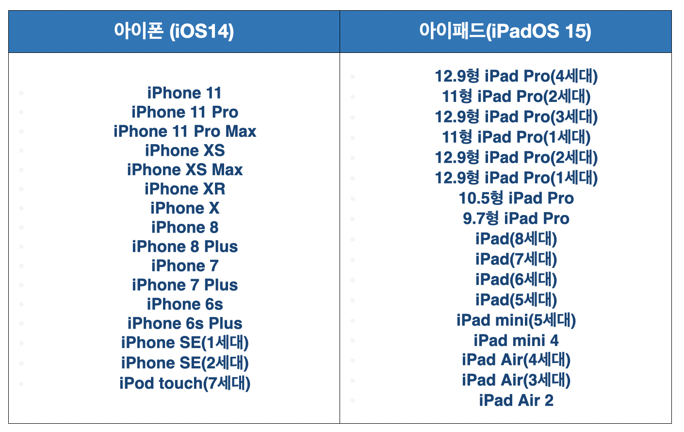 아이폰의 경우 아이폰 6s 이후에 출시된 모델부터 업데이트가 가능하며, 아이패드는 일반형 기준 5세대 이후로 출시된 모델부터 가능합니다.