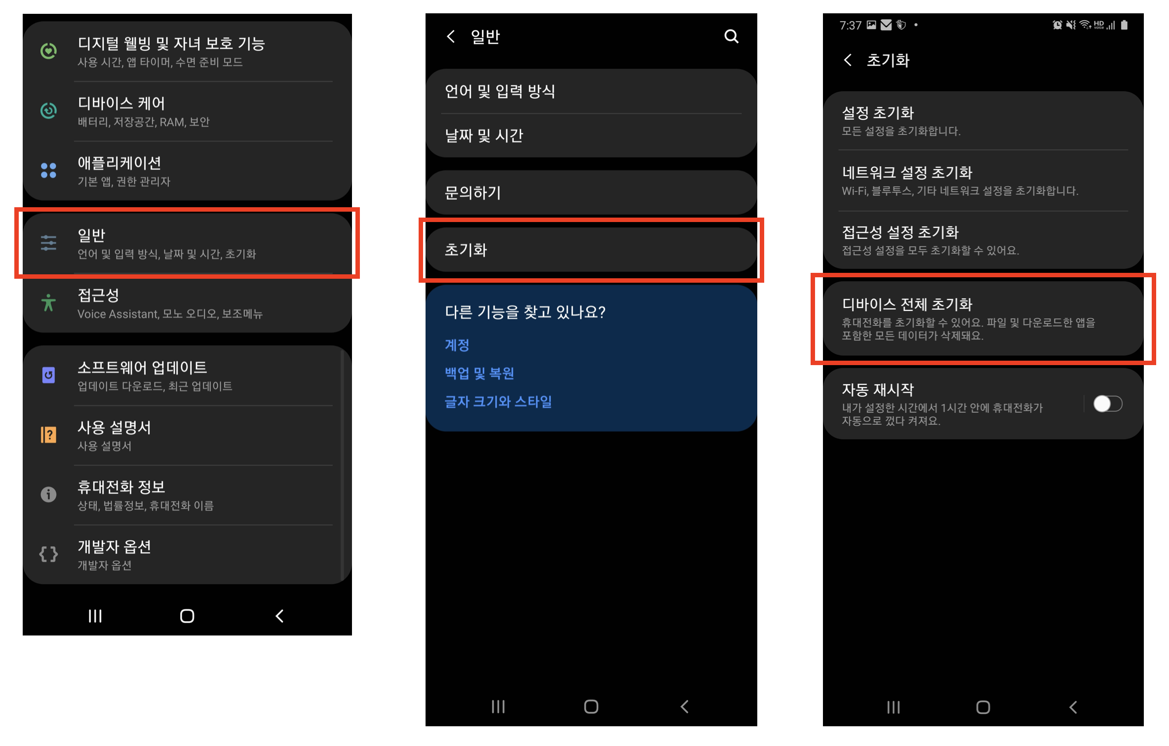 3. 갤럭시폰의 경우 일반> 초기화> 디바이스 전체 초기화